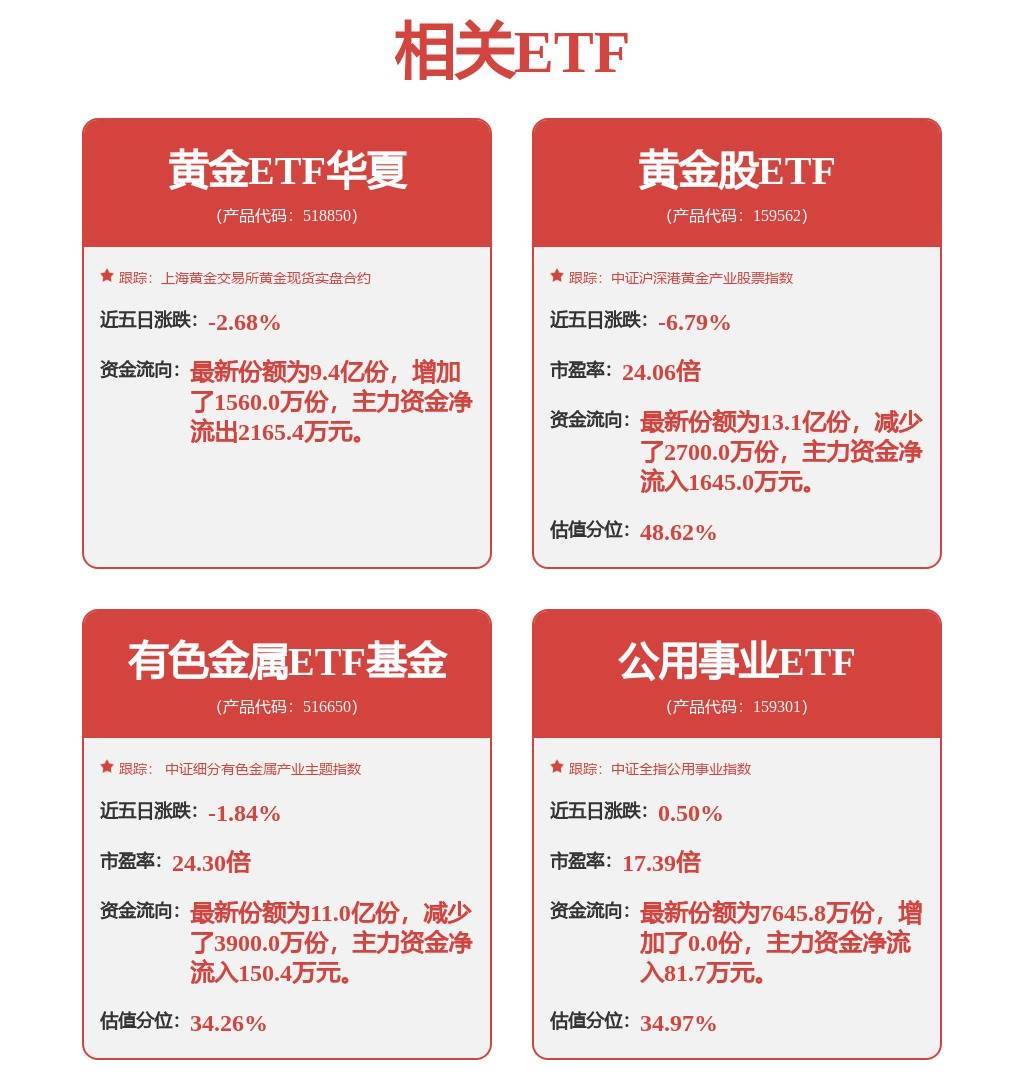 10月24日配资选股,受隔夜金价止跌反弹带动,黄金相关ETF产品纷纷上涨,截至9:40,黄金ETF华夏(518850)涨0.42%,黄金股ETF(159562)涨0.57%,有色金属ETF基金(516650)涨1.52%,其持仓股雅化集团开盘涨停,中矿资源、永兴材料、国城矿业、洛阳钼业等股纷纷上涨。