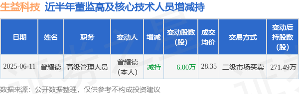 证券之星消息,根据6月12日市场公开信息、上市公司公告及交易所披露数据整理,生益科技(600183)最新董监高及相关人员股份变动情况:2025年6月11日公司高级管理人员曾耀德共减持公司股份6.0万股,占公司总股本为0.0025%。变动期间公司股价上涨3.39%股票配资app下载,6月11日当日收盘报28.07元。